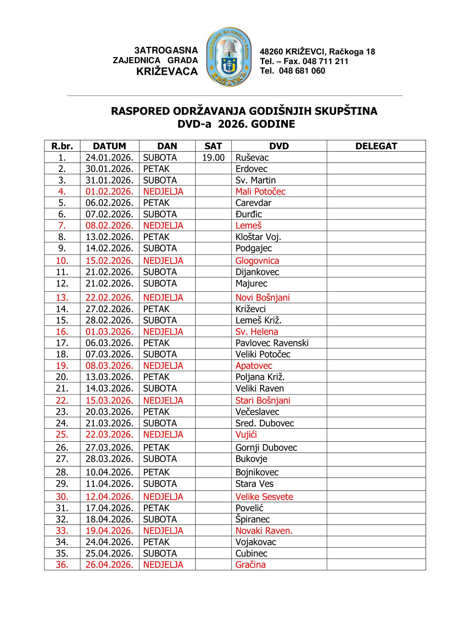 RASPORED ODRŽAVANJA SKUPŠTINA DVD-a 2026. GODINE